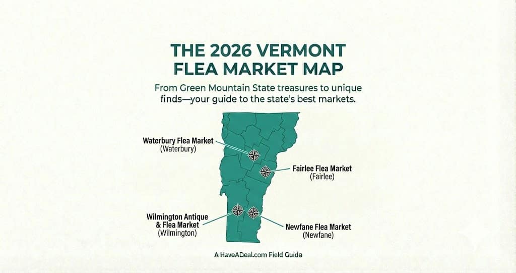 Vermont Flea Markets 2026: The Green Mountain Picker’s Field Guide · HaveADeal.com VT 🍁 Vermont · Green Mountain State Vermont Flea Markets:The Green MountainPicker’s Field Guide A professional scout’s codex for navigating mud season, barn co-ops, and the pre-dawn dealer…